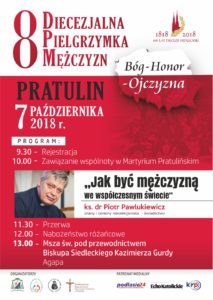 W dniu 7 października br. w Roku Jubileuszu 200-lecia istnienia naszej diecezji odbędzie się po raz VIII Diecezjalna Pielgrzymka Mężczyzn do Pratulina. Hasłem tegorocznego spotkania są słowa: „Jak być mężczyzną we współczesnym świecie” które przybliży ks. dr Piotr Pawlukiewicz znany i ceniony rekolekcjonista. Rozpocznie się ono o godz. 10.00 w Martyrium Pratulińskim.